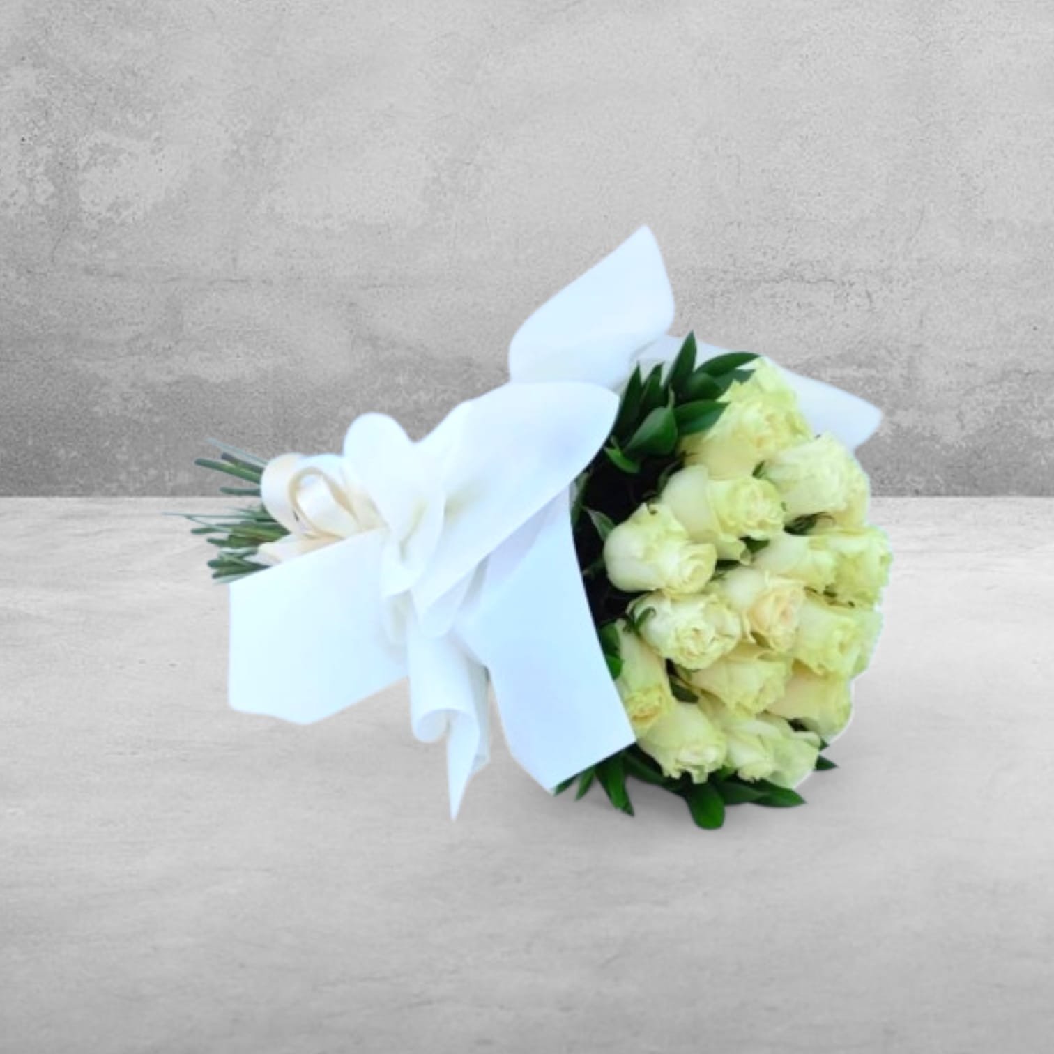 Un bouquet de 25 rosas blancas frescas, acompañado de follaje verde y lazo blanco, ideal para transmitir pureza, gratitud y elegancia en celebraciones especiales o como regalo delicado.