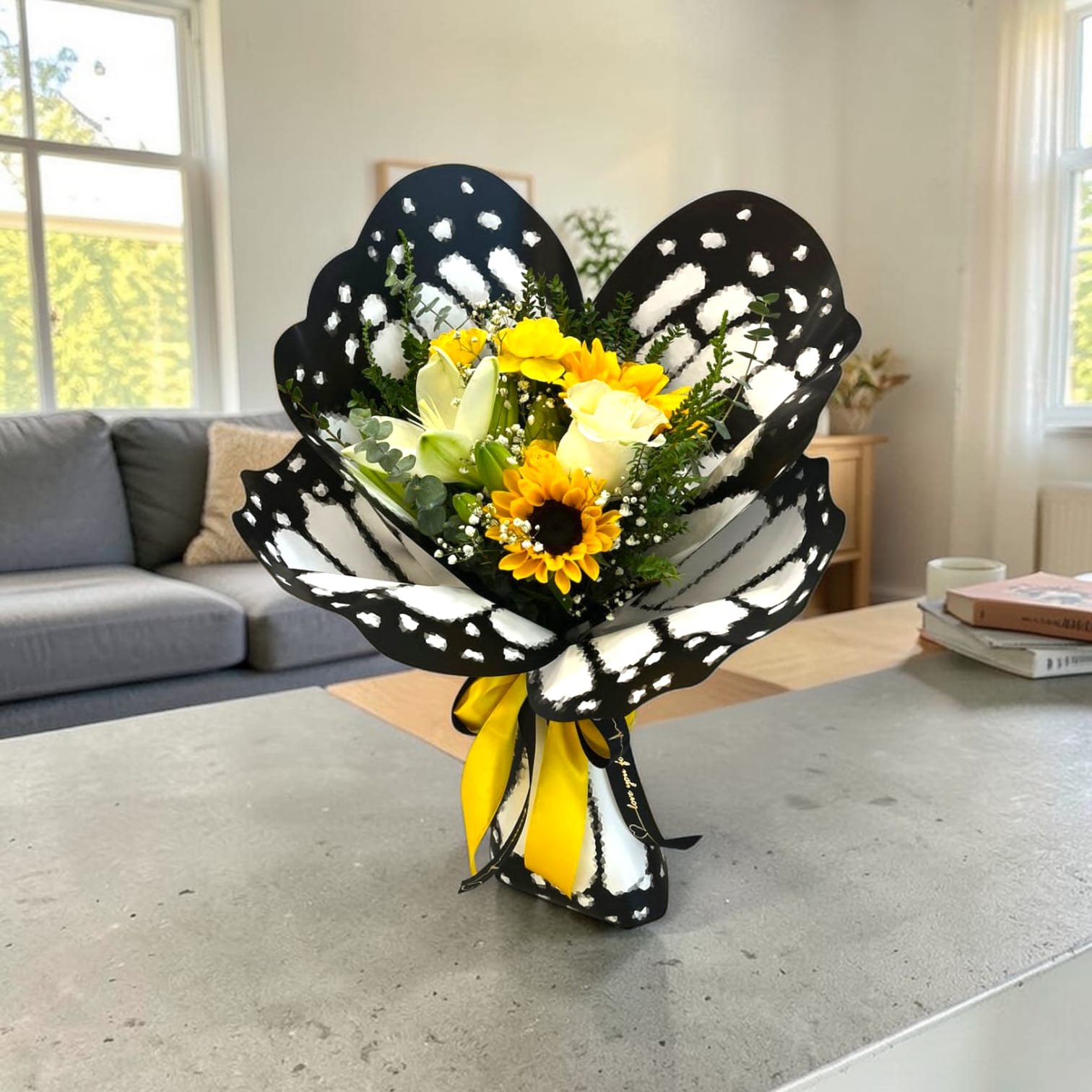 Un elegante ramo de flores en tonos amarillos y blancos, compuesto por girasoles, rosas y lirios, acompañado de delicadas flores de relleno y follaje verde. Su envoltura artística en forma de alas de mariposa, con detalles en negro y blanco, junto a un lazo amarillo con acento negro, lo convierten en un detalle único y sofisticado, ideal para sorprender en ocasiones especiales.