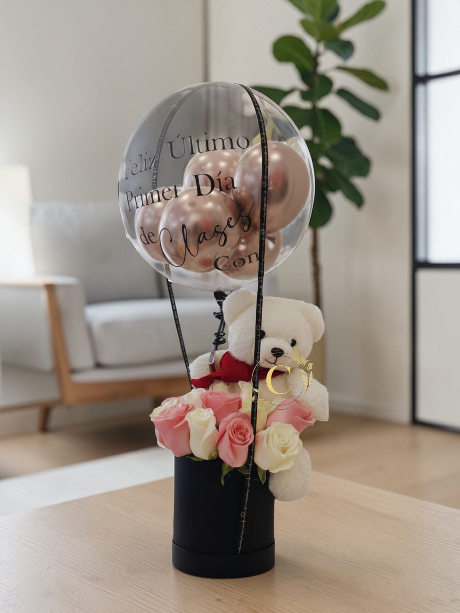 Arreglo decorativo en forma de globo aerostático con globo transparente relleno de globos metálicos rose gold, base cilíndrica negra con rosas frescas rosadas y blancas, acompañado de un tierno oso de peluche. Incluye mensaje personalizado.